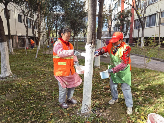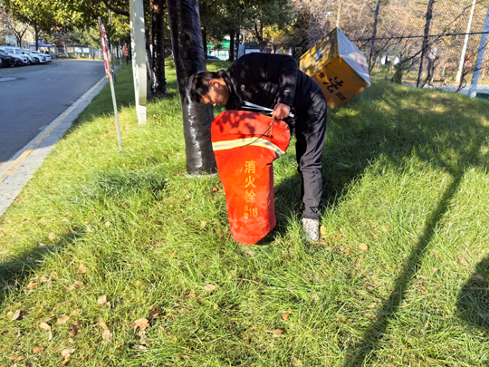 細心的業(yè)主不難發(fā)現(xiàn),樹木已悄然穿上整齊的“冬裝”。物業(yè)工作人員有條不紊地對喬木根部進行涂白處理。這層白色“防護衣”不僅美觀,更是樹木越冬的“守護者”——它能有效反射部分陽光,減緩樹干因晝夜溫差過大而導致的凍裂風險,同時清除樹皮縫隙中潛藏的害蟲及蟲卵,為來年春季樹木茁壯成長打下堅實基礎。