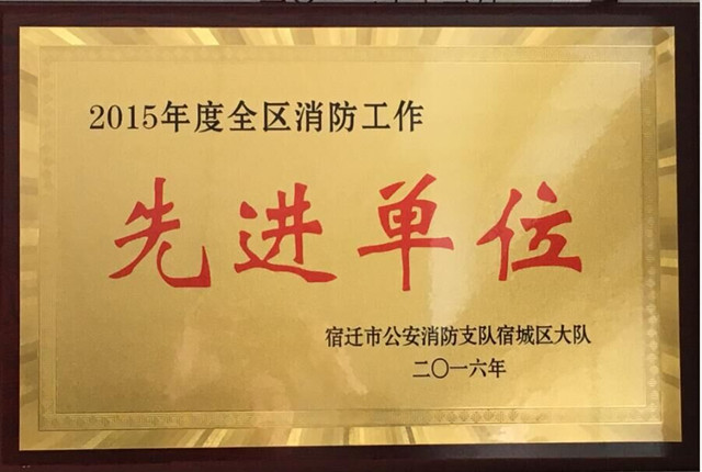 公司在2015年度全區(qū)消防安全工作評定中,喜獲“2015年度全區(qū)消防工作先進(jìn)單位”榮譽(yù)稱號,此次消防安全工作由宿遷市消防支隊(duì)宿城區(qū)大隊(duì)評定。